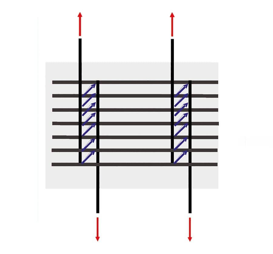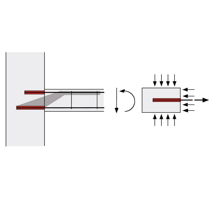 Lasten in den nachträglich mit BTI Injektionsmörtel UVT Top bzw. UVT Top-Z eingemörtelten Bewehrungsstäben werden über Zug- und Druckstreben in die vorhandene Bewehrung weitergeleitet. Dabei dürfen die nachträglich  eingemörtelten Stäbe wie einbetonierte Stäbe behandelt werden.  Bewehrungsstäbe können mit (Bild 1) und ohne (Bild 2) Anschlussbewehrung  eingemörtelt werden.