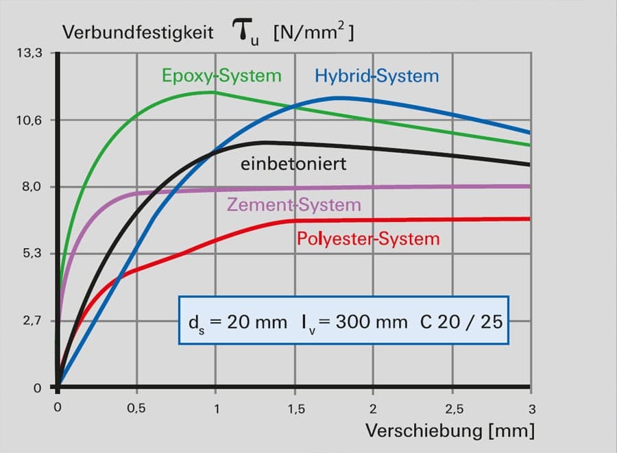 Last-Verschiebungsverhalten einbetonierter und eingemörtelter Stäbe (Quelle: Spieth, H.; Eligehausen, R. (2002): Bewehrungsanschlüsse mit nachträglich eingemörtelten Bewehrungsstäben. Beton- und Stahlbetonbau 97, Heft 9, 2002.)