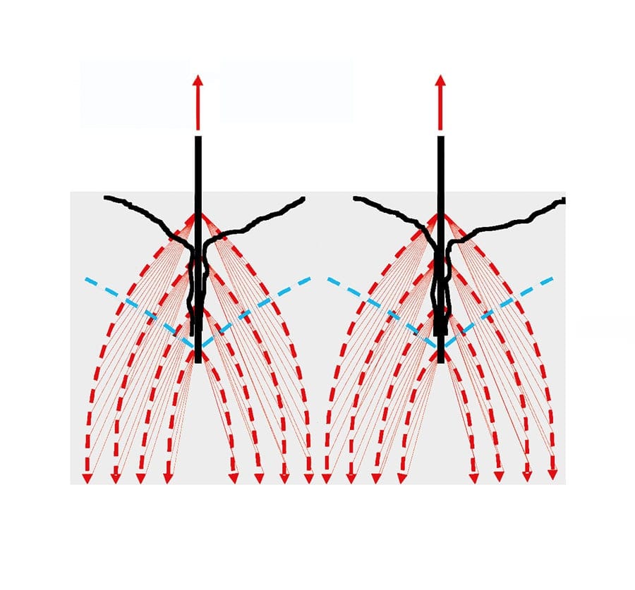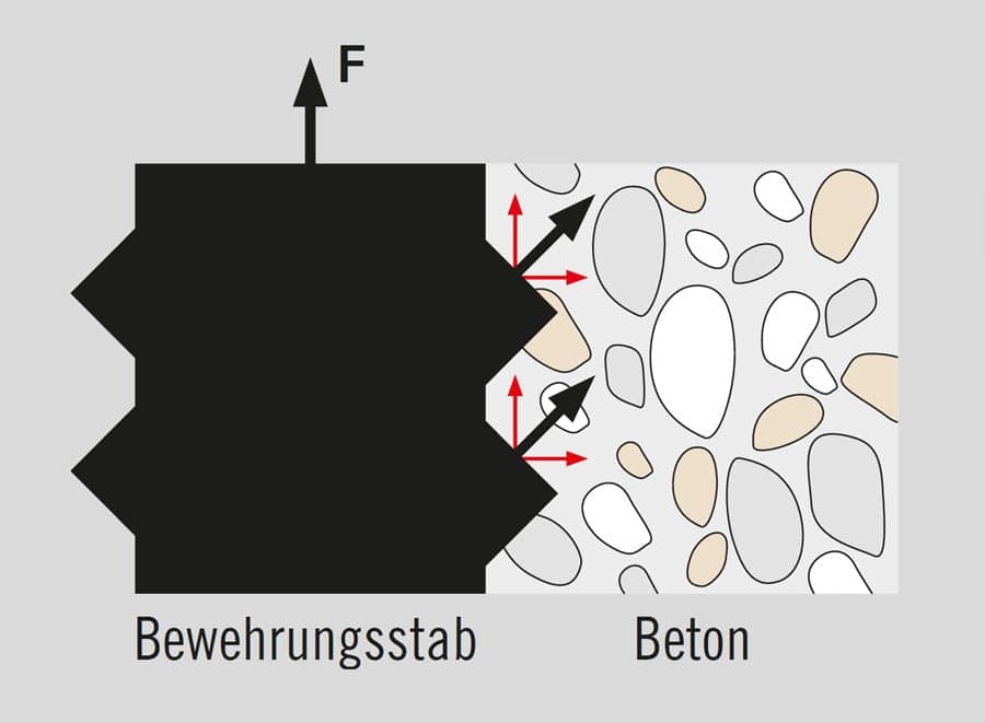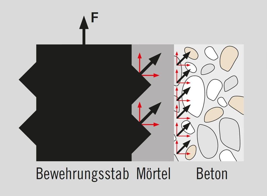 Beim einbetonierten Stab wird die Zug- oder Druckkraft im Stab über die Rippung als Druckkraft in den Beton eingeleitet (Bild 2). Beim nachträglich eingemörtelten Stab werden die Kräfte über die Rippung zunächst in den Injektionsmörtel übertragen, der sie dann über Kornverzahnung und Verbundwirkung in den umgebenden Beton einleitet (Bild 3).