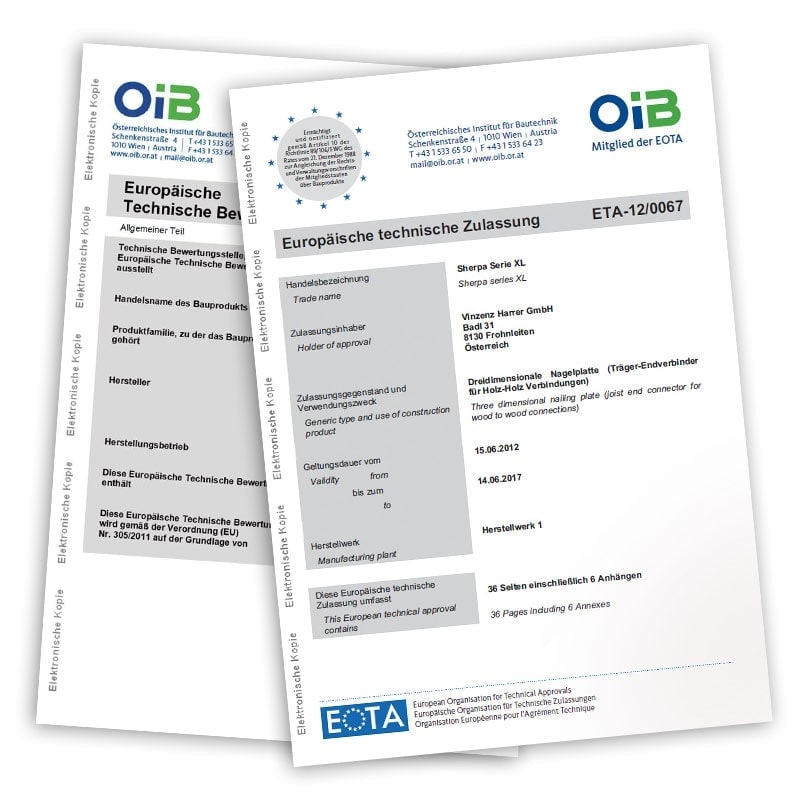 Die Europäischen technischen Zulassungen ETA-12/0067 und ETA-15/0540 gewährleisten das hohe Maß an Sicherheit unserer Produkte. Darin sind alle wichtigen Bestimmungen zu Qualitätssicherungen, zu den Anwendungsbereichen und Materialkennwerten sowie die dafür maßgeblichen Normen genau ausgeführt und beschrieben.