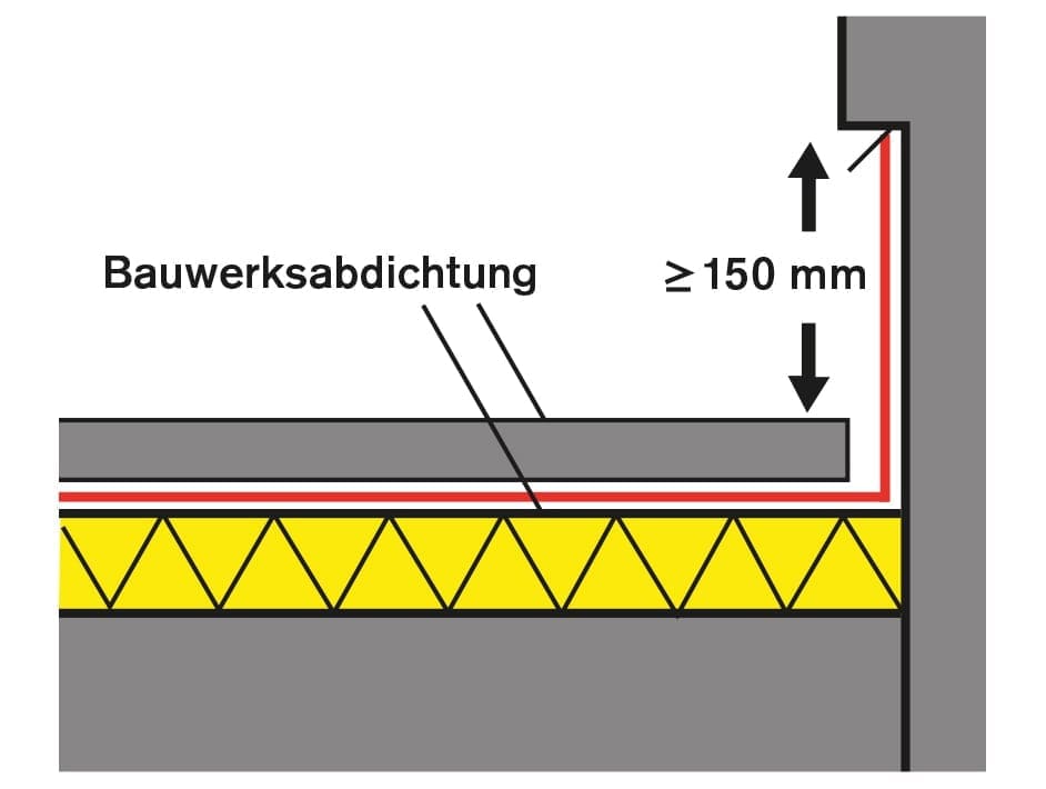 „[…] Im Sockelbereich muss der Untergrund so geplant sein, dass bei Abdichtungen gegen Bodenfeuchte und zeitweise aufstauendes Sickerwasser die Abdichtung im Regelfall bis 300 mm über Oberkante Gelände geführt werden kann, um ausreichende Anpassungsmöglichkeiten der Geländeoberfläche sicherzustellen. Im Endzustand sollte dieser Wert das Maß von 150 mm nicht unterschreiten. […]“