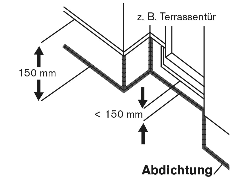 Diese Unterschreitung der Abdichtungshöhe ist erlaubt bzw. teilweise notwendig. Bspw. bei barrierefreien Hauseingängen oder Terrassentüren, allerdings nur dann, wenn die Schwellenabschlüsse durch einen konstruktiven Wetterschutz, wie z. B. Vordächer, entwässerte Rinnen mit Gitterrosten usw. geschützt werden (siehe DIN 18533). Eine fachgerechte Sockelabdichtung kann generell mit 2 verschiedenen Varianten erfolgen: