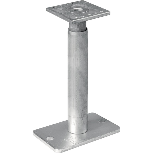 Der Stützenfuß Typ P-PX kann ohne weitere Abbundarbeiten und Vorbohren mit den mitgelieferten Vollgewindeschrauben montiert werden. Nach der Montage ist der Stützenfuß weiterhin höhenverstellbar und z. B. nachträgliche Setzungen der Fundamente können dadurch ausgeglichen werden