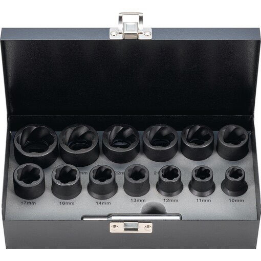 • Zum Lösen von stark beschädigten Schrauben, Muttern und Bolzen. Durch das sich verjüngende Spiralprofil "beißt" sich die Stecknuss an der Schraube, Mutter oder Bolzen fest und ermöglicht so ein Lösen